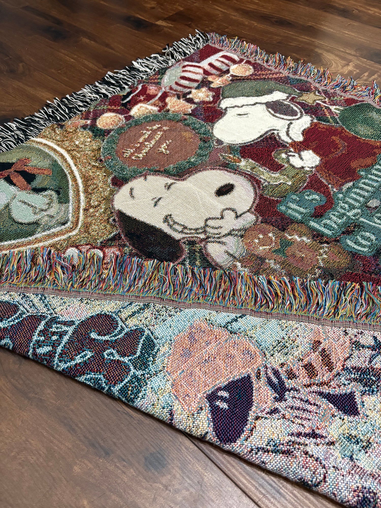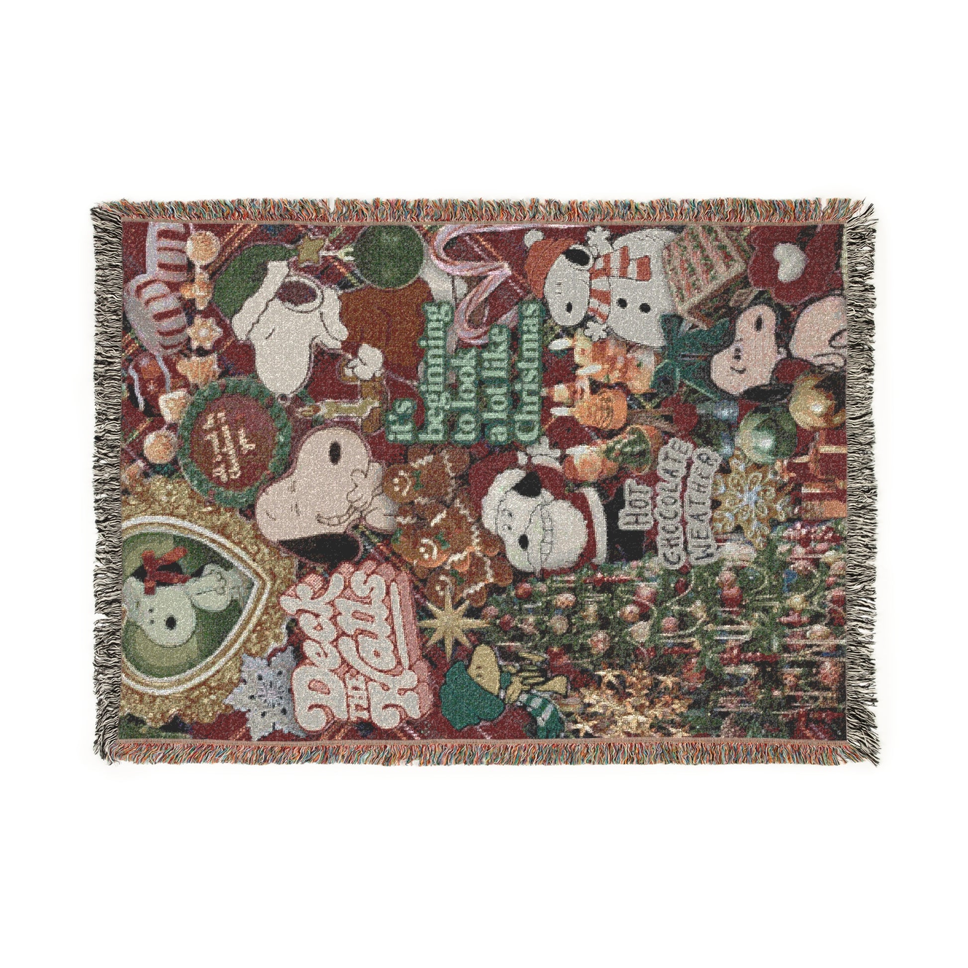 Celebrate the season in cozy style with this festive Snoopy blanket. Woven with rich holiday colors and soft texture, it’s the perfect way to bring warmth and Peanuts cheer to your home.